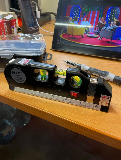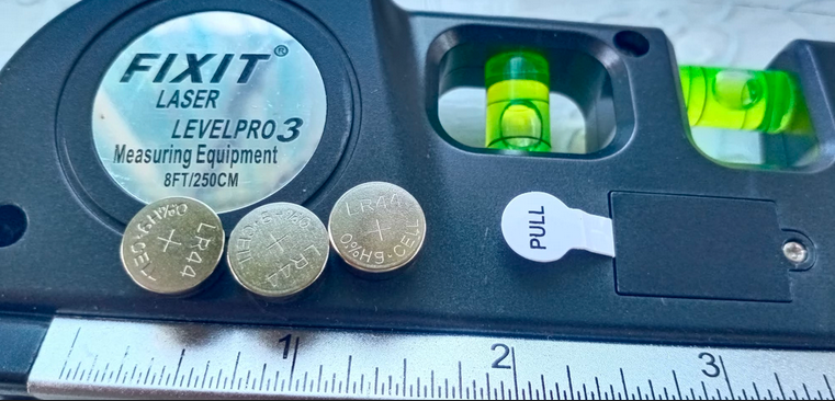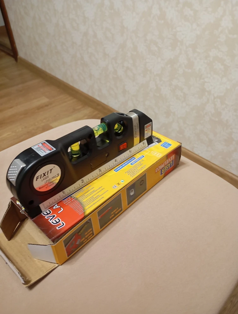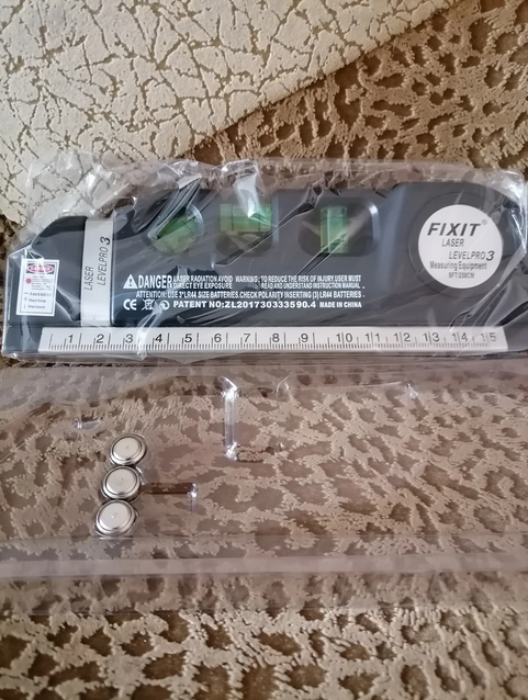- Комплектация: 3 доп. батарейки, уровень пузырчатый, уровень лазерный, линейка см, линейка дюйм, рулетка